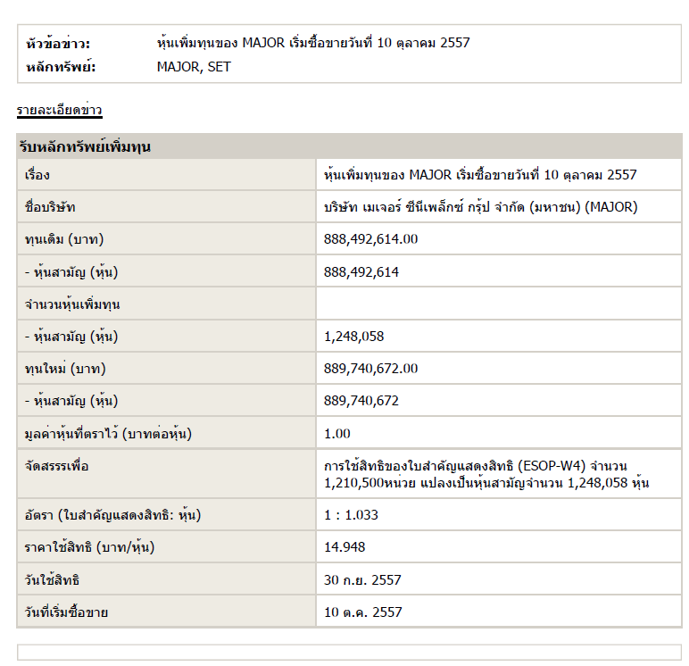 หุ้นเพิ่มทุนของ MAJOR เริ่มซื้อขายวันที่ 10 ตุลาคม 2557 หมายถึงอะไรหรอครับ