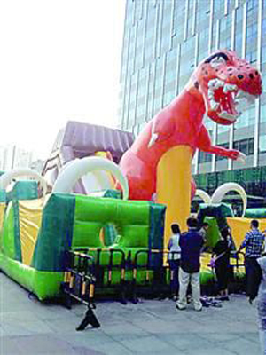 สำหรับปราสาทเป่าลมหลังนี้ ตั้งอยู่ใน Treasure Square สวนสนุกสุดฮิตในเมือง เป็นปราสาทขนาดตึกประมาณ 2-3 ชั้น รูปร่างคล้ายไดโนเสาร์ ซึ่งการเล่นแต่ละครั้ง ผู้เล่นต้องจ่ายเงิน 100 หยวน หรือประมาณ 500 บาท นอกจากนี้ ในสวนสนุกดังกล่าวยังมีบอลเป่าลม รถบั๊ม และงานวาดรูประบายสีของเด็ก ๆ ด้วย