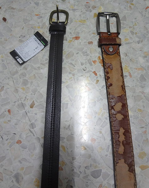 ลองมาดูกันระหว่างสินค้าไดโสะกับสินค้าคลองถมครับ ประสบการณ์ตรง เอามาแชร์กันชัดๆ ด้านขวาคือเข็มขัดหนังแท้จากคลองถม เส้นละ 100 บาท เขาบอกว่าหนังแท้ ดูจากแสงสลัวๆ ยามค่ำตอนนั้น มันก็สวยอยู่หรอกนะ จับดูมันก็นิ่มๆ มันคงเป็นสินค้าออกมาจากหลังโรงงานแน่ๆ เลย ร้อยเดียวโคตรถูก ซื้อมาใช้ได้ไม่ถึงสามครั้ง เกิดอาการหนังร่อนครับ ตามภาพเลย แล้วยิ่งใส่ไปเรื่อยๆ ก็ยิ่งร่อนๆๆๆ ออกมาเรื่อยๆ นี่เหรอวะ หนังแท้ มันหนังตัวอะไรกันเนี่ย มันต้องเป็นสัตว์ที่เป็นโรคผิวหนังมาแน่ๆ เลย ส่วนด้านซ้ายคือเข็มขัดที่ซื้อมาจากไดโสะ ภาพนี้ถ่ายเมื่อสัปดาห์ก่อน ตอนนี้ใช้เส้นที่ซื้อจากไดโสะ ในราคา 60 บาท เอวผมใหญ่ผมซื้อเบอร์ LL เลย ยาวเหลือๆ ถ้าเบอร์ L ลองแล้วมันพอดีเกินไป ทางไดโสะไม่ได้บอกว่าหนังแท้ ดูด้วยตายังไงก็พีวีซี จับดูก็แข็งๆ แต่ใช้งานได้ดีครับ ไม่ลอก ไม่ถลอกง่ายเหมือนของคลองถมเลย ใช้มาหนึ่งสัปดาห์แล้ว โอเคเลย