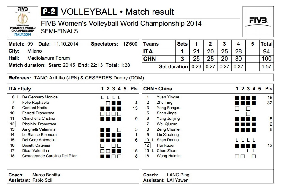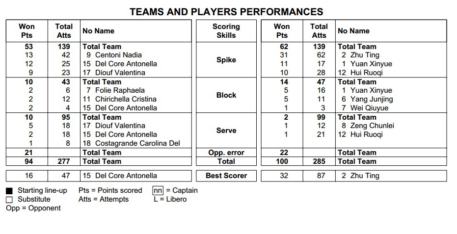เด็กจีนมีศักยภาพมาก แต่ไม่ได้ขึ้นชุดใหญ่สักที พี่ๆ ชุดใหญ่ก็เป๋บ่อยมาก วันนี้เล่ยๆ ตีติดบล๊อคเป็นแต้มให้ฝ่ายตรงข้ามเยอะมาก มีเพียงเข้าบอลกลางซ้อนหลายๆ ชั้นถึงรอด ถ้าเว่ยเซตไปทางซ้ายอิตาลีบล๊อคได้ตลอด