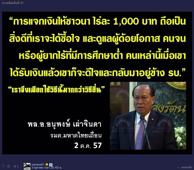 "vanavat1" กับรูปบิดเบือน??? พลเอกอนุพงษ์ ข้อความเกี่ยวกับแจกเงินชาวนา 1,000 บาท