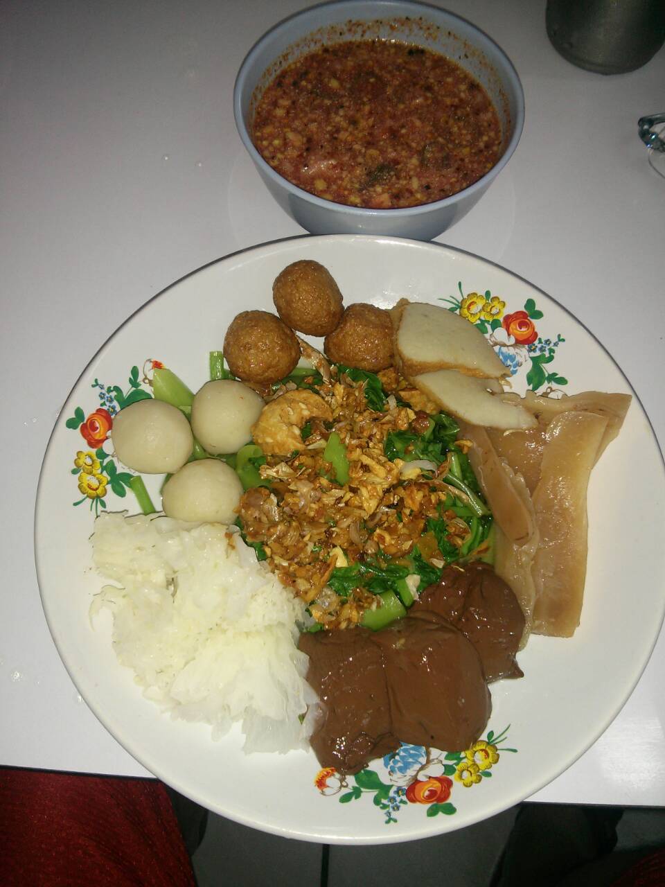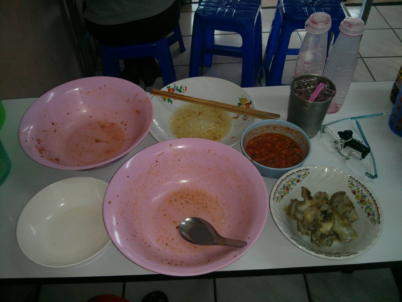 ไปกินเมนูเดิมๆก็เบื่อ เลยครีเอทการกินแบบใหม่ ให้ทำเป็นเหมือนลวกจิ้ม จัดจานให้ดูดีหน่อย แล้วก็ผสมน้ำจิ้ม ให้แม่ค้าปรุงน้ำต้มยำใส่ถ้วยแล้วใส่น้ำแดงของเยนตาโฟผสม เพิ่มน้ำส้มไปอีกหน่อย ก็อร่อยดีแต่ใสไปหน่อยไม่เหนียวข้น ใครจะลอกตามก็ได้นะเผื่อจะกลายเป็นเมนูประจำร้านไปด้วย อิ อิ ราคาก็เท่ากันเกาเหลานะแหละแค่เปลี่ยนรูปแบบ คราวหน้าลองเปลี่ยนเลือดในจานเป็นหมูแดงดูดีกว่า เผื่อจะดูดีขี้น มาดูรูปกัน