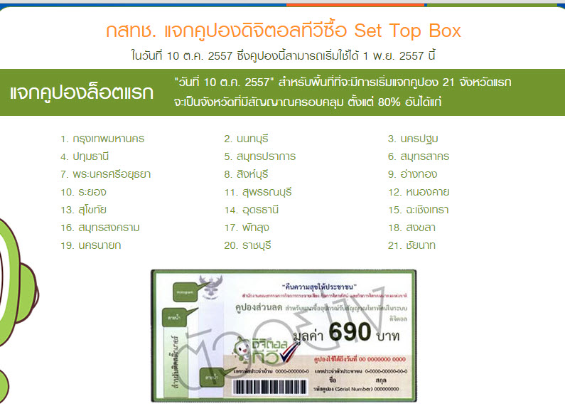 วันที่ 10 ตุลาคมนี้ คูปองทีวีดิจิตอล มูลค่า 690 บาท จำนวน 4,660,000 ฉบับ จากสำนักงานคณะกรรมการกิจการกระจายเสียง กิจการโทรทัศน์ และกิจการโทรคมนาคมแห่งชาติ หรือ กสทช.จะถูกกระจายไปใน 21 จังหวัดตามนี้ ท