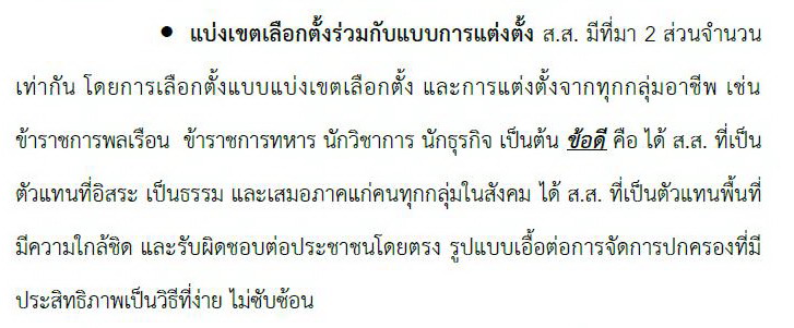 ว่างๆ download มาอ่านกันครับ "หมวดการเมือง" จะเห็นว่าทุกๆ แนวทางว่าด้วยการเลือกตั้ง ส.ส.จะ วิจารณ์ไว้ 2 มุม ทั้งข้อดี-ข้อเสีย
