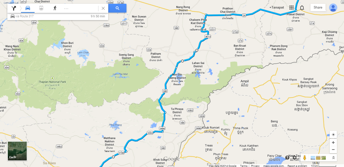 ออกจากจันทบุรี วิ่งเส้น 317 > ผ่าน อ.สอยดาว > เลย อ.เขาฉกรรย์ > เลี้ยวขวาเลี่ยงเมืองสระแก้วไป อ.วัฒนานคร > ถึงวัฒนานครเลี้ยวซ้ายตามป้ายไป อ.ตาพระยา บุรีรัมย์ ละลุ (ถนนหมายเลข 3198 ) > เลี้ยวซ้ายที่แยกช่องกุ่มตามป้าย อ.ตาพระยา บุรีรัมย์ เข้าถนน 3395 > ต่อมาเจอแยก โคคลาน เลี้ยวซ้ายไป 3486 > ขับจนมาถึงสามแยก บ้านใหม่ เลี้ยงซ้ายเข้า 348 มุ่งหน้า บุรีรัมย์ > ขึ้นเขาตรงมามุ่งหน้า อ.ละหานทราย > เลี้ยวขวาที่ อ.ละหานทราย > เลี้ยวซ้ายไปทางพนมรุ้ง(ทางหลวงชนบทหมายเลข 4013) > ผ่านตำบลยายแย้ม > ผ่านตำบลพนมรุ้ง > เลี้ยวขวาที่ถนนหมายเลข 24 ตามป้าย สุรินทร์ > ถึง อ.ปราสาท เลี้ยวซ้ายมุ่งหน้าสุรินทร์ > สุรินทร์ > จอมพระ > ท่าตูม > สุวรรณภูมิ > ยโสธร > นิคมคำสร้อย > มุกดาหาร