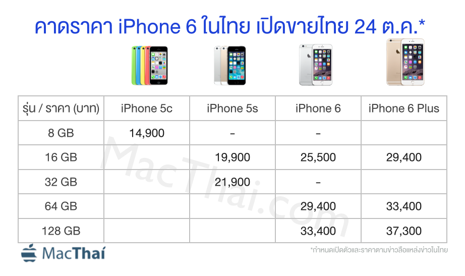 เว็บ MacThai คาดเริ่มต้นที่ 25,500 บาทสำหรับ iPhone 6 16GB แพงสุด 34,300 บาท สำหรับ iPhone 6 Plus 128GB