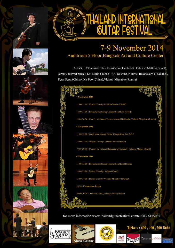 Bangkok Guitar Society and Banana Thai Co.,ltd Proudly present Thailand International Guitar festival 2014 7-9 November 2014 at Auditorium 5th floor Bangkok art and culture centre. Every day concert with World Class classical