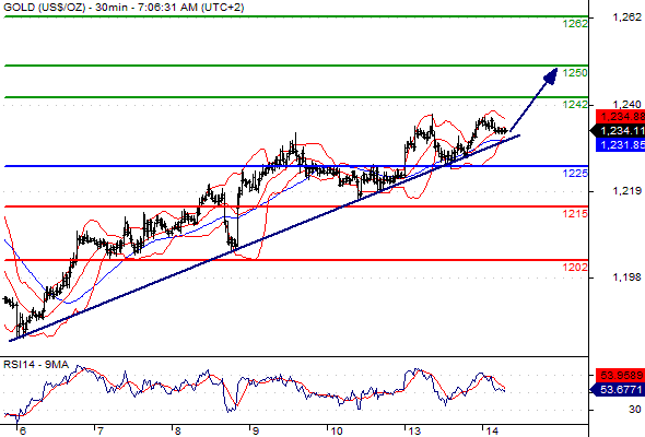 Our preference: Long positions above 1225 with targets @ 1242 & 1250 in extension.