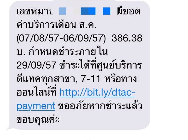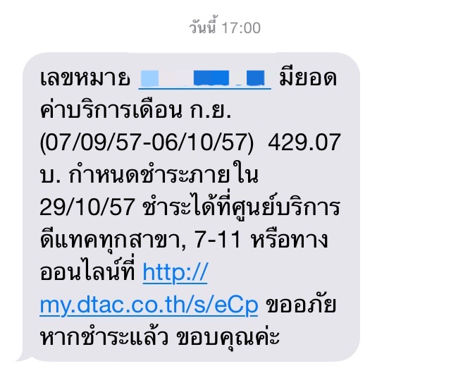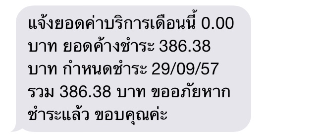 และเมื่อวาน วันที่13ตุลา ก็มีข้อความส่งเพิ่มอีกว่า"คุณมียอดค่าบริการรายเดือน กันยายน (7/9/57-6/10/57) 429.07บาท"