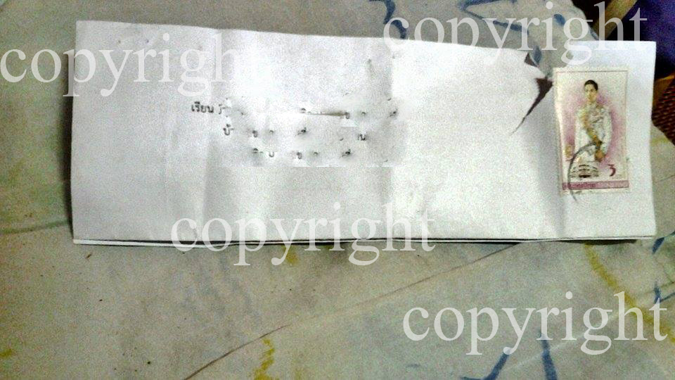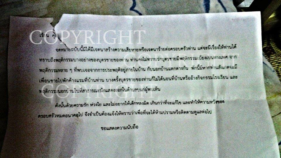 เข้าเรื่องเลยนะครับ มีอยู่ว่า เพื่อนของผมครับชื่อสมมุติ ว่า A นะครับ เรื่องก็คือ มีเพื่อนอยู่ในห้อง มีอยู่กัน 2 คน ครับ ก็คือมีเพื่อน B อีกคนนะครับ แล้วเพื่อน B นี่เป็นคนแอบชอบ A แล้วซึ่งคนที่ชื่อ B นี่นะครับ เป็นคนที่นิสัยแบบว่า รักชอบใครก็รักแบบสุดๆ น่ะครับ แต่ คนที่ชื่อ A ก็ไม่ได้คิดอะไรนะครับ แล้วไม่พูดกันกับคนที่ชื่อ B ด้วย มีช่วงหนึ่ง คนที่ชื่อ A น่ะครับ ไปคบหากันกับแฟน ซึ่งเป็นแบบรักแบบชายรักชาย น่ะครับ ก็คบหากันได้เดือนกว่าๆ ผมซึ่งเป็นเพื่อนของคนที่ ชื่อ A ก็รู้สึกว่า คนที่ชื่อ B มีความไม่ชอบ อยากสร้างความเดือดร้อนให้ ชอบตามรังควาน ประมาณนี้ อ่ะครับ คนที่ชื่อ A ซึ่งก็ไม่ได้คิดอะไรกับคนที่ชื่อ B อยู่แล้ว จากนั้นเวลาก็ผ่านมาอยู่พักใหญ่ เพื่อน A คนนี้ก็พาแฟนไปที่บ้านบ้าง ทางบ้านก็ไม่ได้ว่าอะไร ซึ่งเพื่อน B ก็เหมือนจะติดตามความเคลื่อนไหวตลอด อ่ะครับ เหมือนตามจ้องจะจับผิดครับ ผมคิดว่างั้นนะ จากนั้นพักใหญ่เวลาล่วงมานาน ความรักของคนสองคนก็เริ่มหวานกันมากขึ้น แล้วเหมือนคนที่ชื่อ B นี่นะครับ เหมือนจะอิจฉา หรือ อะไรผมก็ไม่ทราบนะครับ แล้วเวลาไม่นานมานี้ ก็มีจดหมายส่งไปยังที่บ้าน คนที่ชื่อ A ครับ และ ลืมบอกไปครับ คนที่ชื่อ A นี่ไม่ได้พักอยู่ที่บ้านนะครับ จะพักอยู่กับน้า คนละที่กับทางบ้านครับ ห่างกันพอสมควร แต่ คนที่ชื่อ A ก็ไปมาหากันบ้าง และสิ่งที่ผมจะให้ดูข้างล่างนี้นะครับ เป็นภาพจดหมายที่ส่งไปยังบ้านของ คนที่ชื่อ A ครับ มีอยู่ว่า (ซึ่งผมคิดว่าคงไม่มีใครที่จะส่งจดหมายไปแบบนี้ละ นะครับ แต่ผมก็ไม่ได้เจตนาว่า คนที่ชื่อ B เป็นคนส่งครับ)