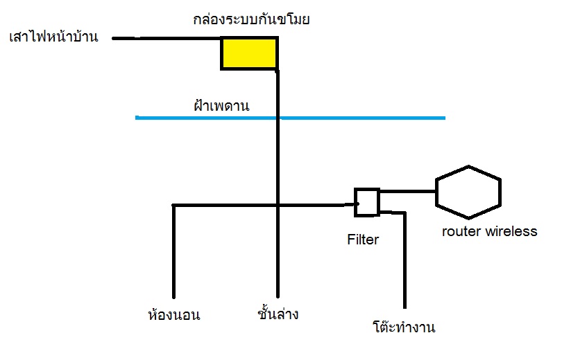 แต่เดิมสายโทรศัพท์ วิ่งเข้า กล่องกันขโมย (ที่บ้านติดสัญญาณกันขโมย ถ้ามีเหตุ จะโทรเข้าเบอร์มือถือ) ใต้หลังคา จากนั้น พ่วงสายมาตามจุดต่างๆในบ้าน โดยที่โต๊ะทำงาน จะต่อ filter เพื่อแยกไปเข้า โทรศัพท์บ้าน กับ router wireless