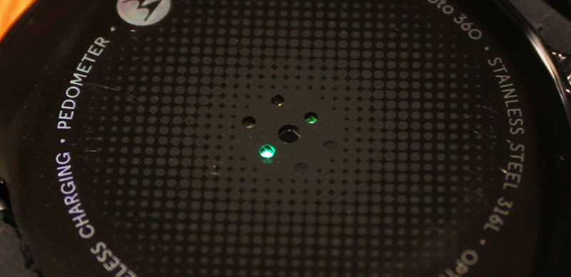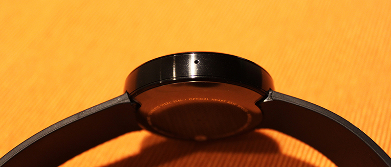 ด้านหลังจะเป็น Optical Heart Rate Sensor สำหรับวัดชีพจรของผู้ใช้ เวลาที่ Sensor ทำงานก็จะยิงไฟสีเขียวๆออกมา