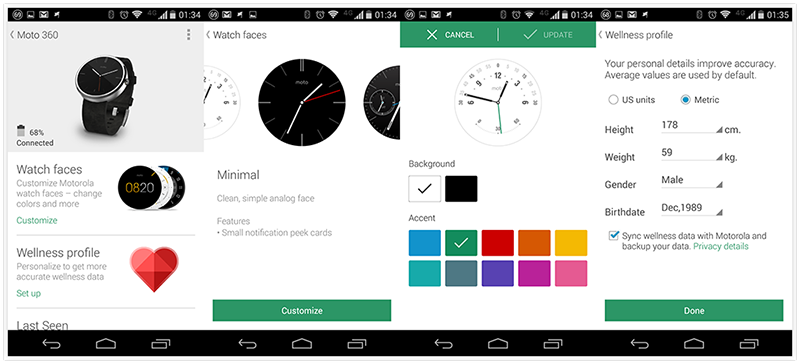 สำหรับ Moto 360 นั้นจะมีลูกเล่นที่มาพร้อมกับ Moto Connect ซึ่งเป็นแอพฯสำหรับเชื่อมต่อ Handheld กับอุปกรณ์ต่างๆ อย่างคอมพิวเตอร์หรือ Moto 360 โดย Moto Connect จะสามารถ Customize Watchface ที่มีอยู่แล้วได้ประมาณหนึ่ง จากหน้าปัดสีดำก็เปลี่ยนเป็นสีขาวได้ เปลี่ยนเข็มวินาทีได้ และมี Wellness Profile ที่เอาไว้ใส่ข้อมูลสุขภาพคร่าวๆอย่าง น้ำหนัก ส่วนสูง เพศ และวันเกิด เพื่อใช้เป็นข้อมูลในการประเมินสุขภาพจาก Moto 360