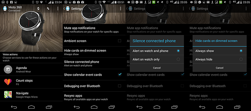 แอพฯ Android Wear ที่อยู่บน Handheld ก็จะมีให้ตั้งค่าคร่าวๆเช่น Default App สำหรับ Voice Command แต่ละอัน หรือจะกำหนดให้แสดง Notification บน Android Wear เท่านั้นก็ได้ (ไม่แสดงบน Handheld) เป็นต้น