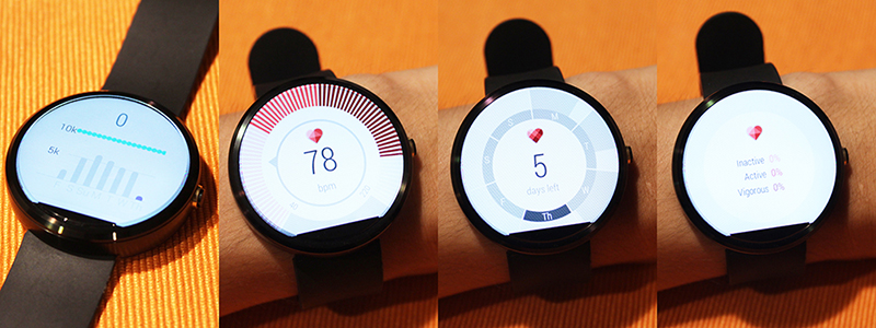 โดย Google Fit บน Moto 360 ก็จะช่วยให้ผู้ใช้สามารถดูข้อมูลอัตราการเต้นของหัวใจได้ ว่าในแต่ละวันมีอัตราการเต้นหัวใจอยู่ในช่วงใดบ้าง เป็นอัตราส่วนเท่าไร (Moto 360 จะมีการวัดอัตราการเต้นของหัวใจอยู่เป็นระยะๆ) หรือข้อมูลของการเดินว่าวันนี้เดินไปแล้วเท่าไร ถึงเป้าหมายที่กำหนดแล้วหรือยัง
