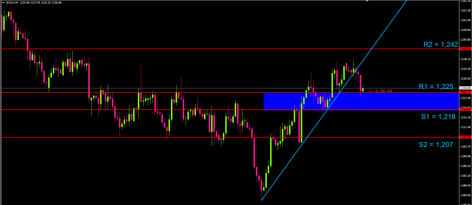 สำหรับทองคำนั้น หลังจากที่ขึ้นมาเป็นเทรนแบบ Sideway Uptrend แล้ว เมื่อคืนเริ่มหลุดเทรนไลน์ และราคาได้ร่วงลงมาที่แนวรับ 1225 ตั้งแต่ตอนเช้า โดยทั้งนี้ต้องรอดูพฤติกรรมของราคาก่อนว่าจะสามารถทะลุแนวรับ 1225 ได้หรือไม่ ซึ่งถ้าหลุดได้ เป้าต่อไปจะอยู่ที่ 1218 และ 1207 ครับ ส่วนแนวต้านใหญ่ตอนนี้ยังคงอยู่ที่ 1242 ครับ