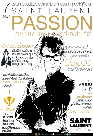 “ อย่าหยุดฝัน จนกว่าจะสำเร็จ “ อีฟ แซงต์ โลรองต์ เป็นเด็กหนุ่มขี้อาย สมัยเรียนประถม เขามักถูกเพื่อนรุมแกล้งเสมอ หลังจากนั้นเขาก็เริ่ม วาดรูป วาดรูป และ วาดรุป ความฝันเพียงอย่างเดียวของเขาก็คือ สักวันหนึ่ง “ ชื่อ SAINT LAURENT จะต้องดัง “ 8 ปีต่อมา เขา ชนะการประกวด การออกแบบดีไซเนอร์ของโลก และด้วยวัยเพียง 22 ปี คริสเตียน ดิออร์ ยกย่องให้เขาเป็น ดีไซเนอร์ ที่เก่งที่สุดของยุค จากนั้น 7 ปี อีฟ แซงต์ โลรองต์ ได้สร้างแบรนด์เสื้อผ้าเป็นของตัวเองภายใต้ชื่อ “ SAINT LAURENT “