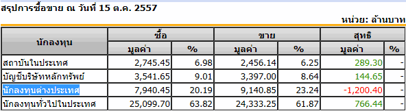Sinthorn Summary 15/10/2557 : ต่างชาติขายสุทธิ -1,200.40 ลบ.