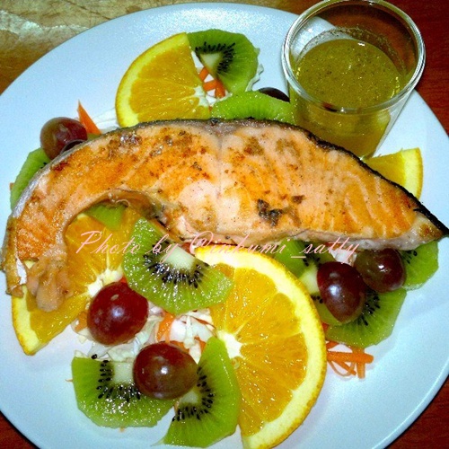 2. สลัดแซลมอน จานนี้มีน้ำสลัดแบบใส ใช้น้ำส้มคั้นสดเป็นหลักค่ะ