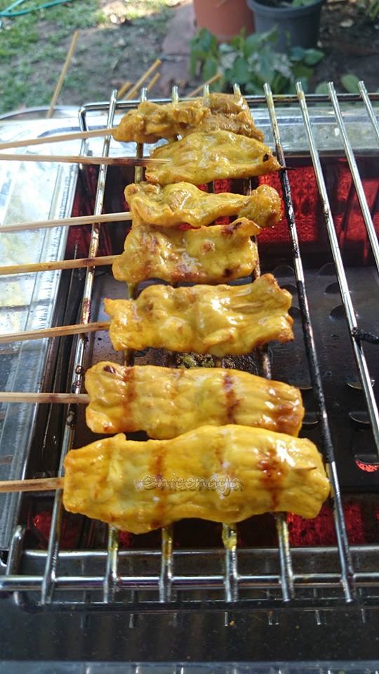 เริ่มด้วย หมูสะเต๊ะ ...อุตส่าห์หอบหิ้วเตาย่างไร้ควันมาจากไทย คัมค่ะ ใช้ดีด้วย