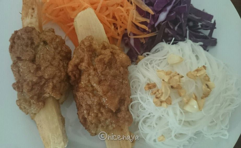 หมูสามชั้น สันคอหมู เนื้อวัว นำมาหมักด้วยเครื่องเทศสะเต๊ะ นำไปทอดในกระทะไฟฟ้า (แทนการเสียบไม้ปิ้ง) ทานพร้อมน้ำสะเต๊ะ เครื่องหมักสะเต๊ะ ได้แก่ ตระใคร้ ข่า ลูกผักชี ยี่หร่า ขมิ้น เกลือ และ