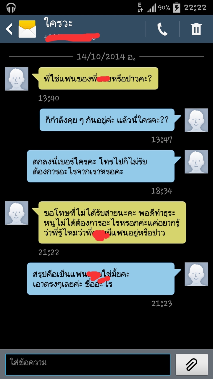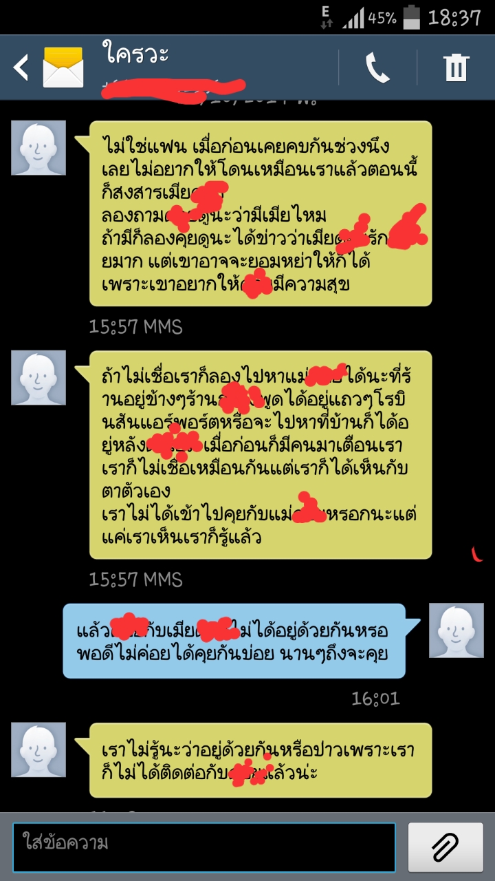 สวัสดีเพื่อนๆชาวพันทิปค่ะ เริ่มกันเลยนะคะ เราได้รู้จักกับผู้ชายคนนึงอยู่ที่จ.เชียงใหม่ค่ะ เราคุยกับเค้าครั้งแรกทางไลน์ค่ะ แล้วหลังจากนั้นก็ได้เบอร์มาโทร วิดีโอคอลบ้างบางโอกาสถ้ามี เกือบ2เดือนละที่คุยกัน คุยทุกวันซึ่งเราก็คิดว่าไม่น่าจะมีปัญหาอะไร ดูเค้าก็เป็นผู้ชายง่ายๆ เรียบๆ เรา2คนต่างคนต่างทำงาน ก็ไม่คิดว่าจะมีเรื่องแบบนี้เกิดขึ้น จนมาเมื่อ1-2วันที่ผ่านมาก่อนจะมาตั้งกระทู้ ก็มีข้อความจากหญิงนิรนามส่งมาที่เครื่องเรา พอเราเห็นก็เฮ้ย งง อ่ะ ใครวะ?? อำกันรึป่าว หรือมีการลองใจอะไรชั้นรึป่าวเนี่ย!! (มีภาพประกอบค่ะ)