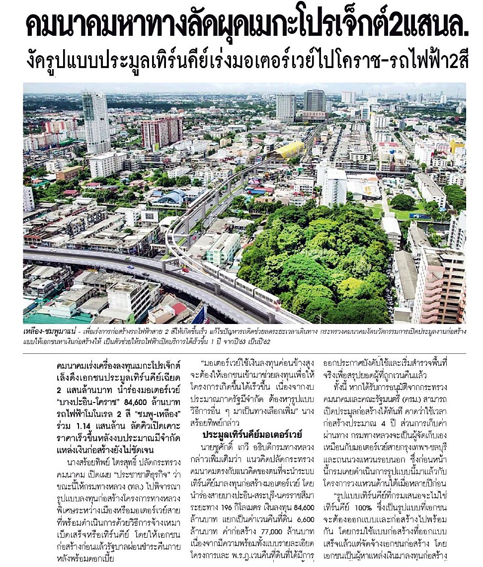 คมนาคมหาทางลัด ผุดเมกะโปรเจ็กต์2แสนล้าน งัดรูปแบบประมูลเทิร์นคีย์ เร่งมอเตอร์เวย์ไปโคราช-รถไฟฟ้า2สี