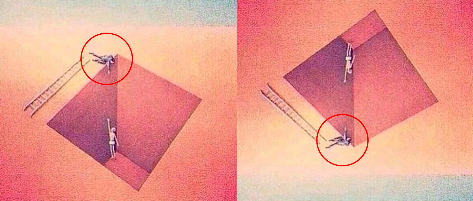 ภาพด้านซ้าย : เมื่อใดที่เราพลาดลงหลุม มันกลับไม่ช่วยเราเต็มที่ ไม่เต็มใจที่จะช่วย ทั้งๆที่มันก็ช่วยได้สบายๆ ปล่อยให้เราตะเกียกตะกายช่วยตัวเอง รอให้เราพินาศ เรียกง่ายๆ มันพร้อมจะหักหลังเรา โดยที่เราแทบไม่รู้ตัวเลย