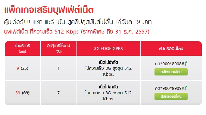 ตามหัวข้อครับ สมัครในนามนิติบุคคค จำกัดงบราว 400 บาท / เดือน 1) รายเดือน - ติด FUP ที่ 512 kbps ตั้งแต่ MB แรก 2) รายเดือน - 3G/4G จำนวน x GB เมื่อใช้ครบ FUP 256 kbps 3) เติมเงิน - ติด FUP ที่ 512