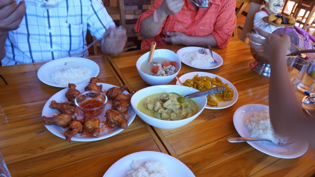 แต่อร่อยใช้ได้เลย มี 4 อย่าง คือ แกงเขียวหวานหมู ฟักทองผัดใส่ไข่ ต้มยำปลาอะไรสักอย่าง และไก่ทอด กับข้าวเติมได้