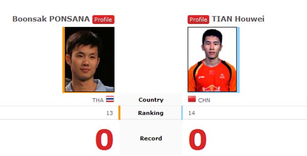 [MS] Boonsak PONSANA vs TIAN Houwei แข่งคู่ที่ 3 โดยคู่แรกแข่งเวลา 20.30 น. (คอร์ท 2)