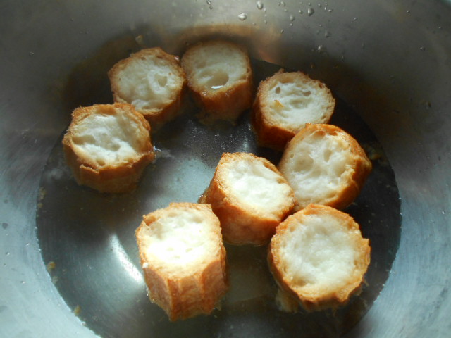 1) หั่นฝุเป็นแว่นหนาๆ แล้วแช่ในน้ำร้อนสัก 5-10 นาที แต่มันจะลอยขึ้นมา เอาจานวางทับไว้ก็จะช่วยให้ดูดน้ำได้ดีและเร็วขึ้นค่ะ