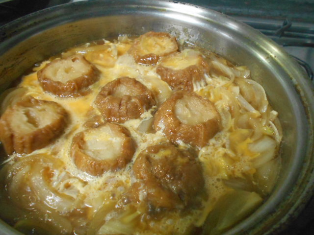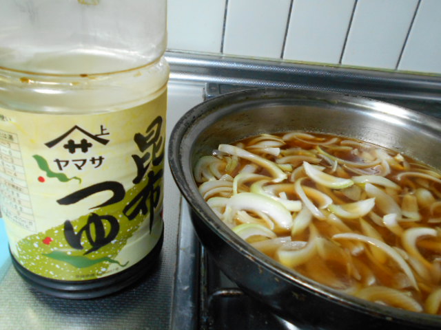 2) หั่นหอมเป็นเสี้ยวๆ ผัดน้ำมันในกระทะ พอนุ่มก็ใส่น้ำพอท่วม ใส่ทซุยุลงไปปริมาณสักครึ่งหนึ่งของน้ำที่ใส่