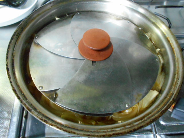 3) ใส่ฝุลงไป แล้วเอาฝาอะไรกดทับ เพื่อให้รสชาติน้ำซุปเข้าถึงเครื่องปรุง