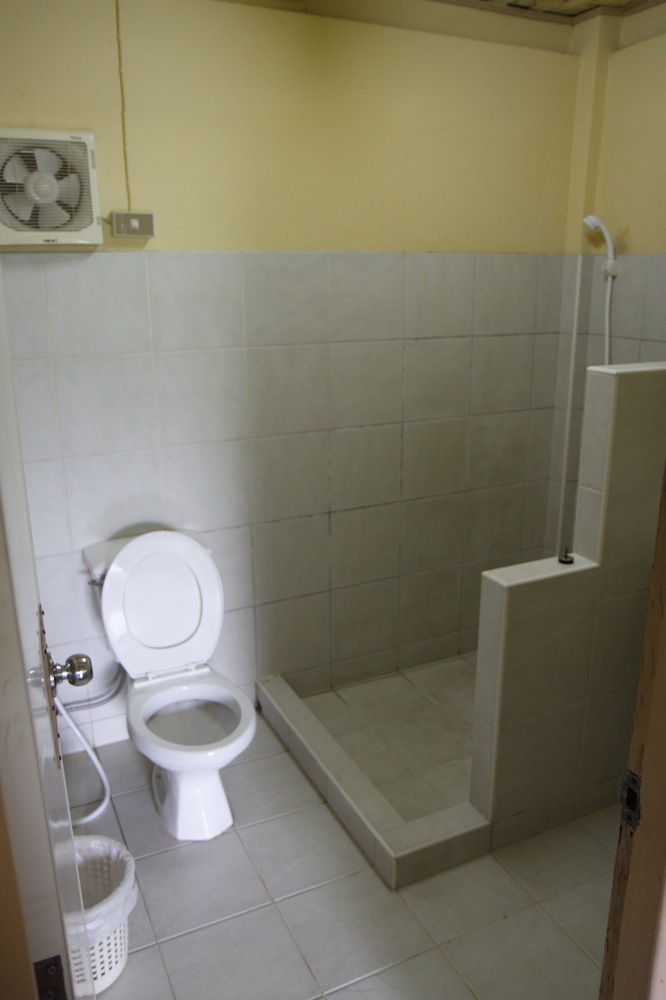 หน้าตาห้องน้ำค่ะ ฝักบัวมีที่ทำน้ำร้อนให้ ด้านขวามือในห้องน้ำมีอ่างล้างมือด้วย ที่กั้นในห้องน้ำนี่น้องเราบ่นมากเพราะมีกั้นแต่ด้านข้าง เวลาอาบจริงๆน้ำก็กระเด็นออกไปทางฝั่งชักโครก แล้วเหยียบกันไปเหยียบกันมาส่วนที่แห้งก็เปียกหมดอยู่ดี