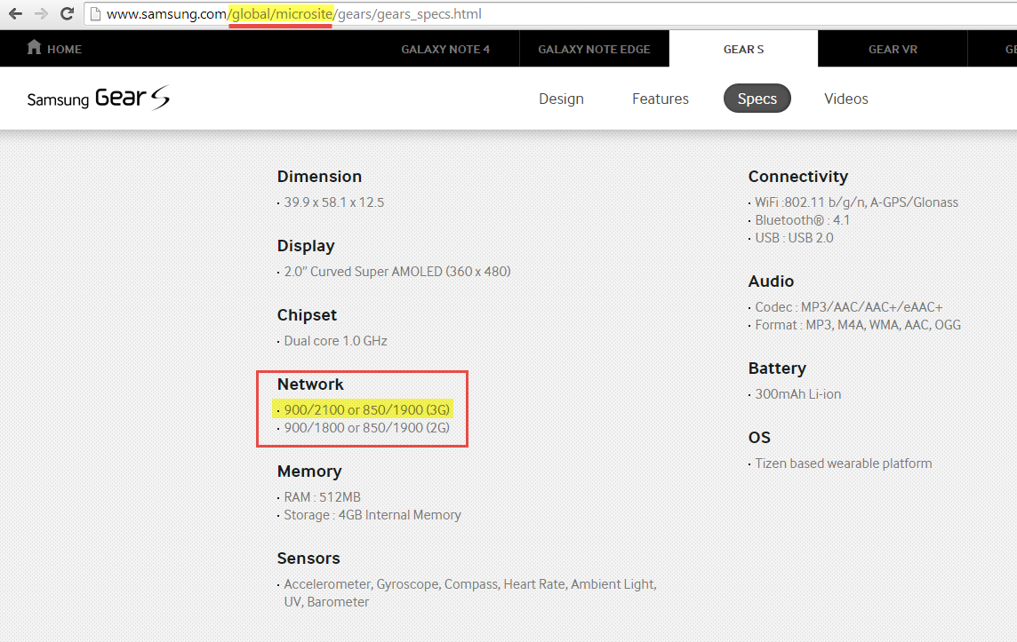 อันนี้เป็น screenshot จากเว็บไซท์อย่างเป็นทางการของซัมซุงประเทศไทยครับ ระบุไว้ว่า Gear S รองรับความถี่ 900/2100 MHz