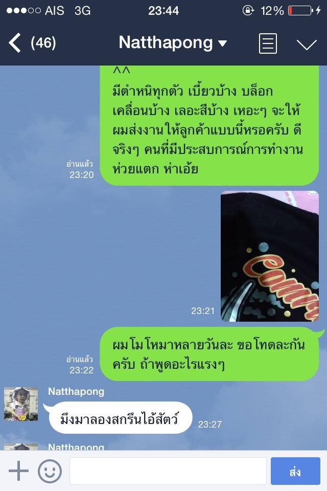 คือตอนนั้นร้านผมยังไม่เสร็จไม่ดีสมบูรณ์ วันนั้นผมจะทำงาน จะถ่ายบล็อกแต่ไฟในตึกไม่พอ เลยหาร้านที่มันเปิด24ชั่วโมง เพื่อที่จะหาที่ถ่ายบล็อก พอมาเจอร้านนี้ ลองโทไปคุย บอกว่า ผมต้องส่งงานอีกวันก่อน4โมง ละคือกผมบอกลูกค้าแล้วว่าทำทันแน่นอน แต่พอเจอปัญหาถ่ายบล็อกไม่ได้ เลยคุยกับเขา เขาก็พูดดี นัดผมว่าให้เข้าไปที่ร้านสุขุมวิท16 ซอยเศรษฐี2 นัดผม11โมง เขาบอกจะช่วยสกรีน บอกลูกค้าไปเลยว่าบ่าย3ทันแค่80ตัว ผมไปรอตั้งแต่10โมง เขามาบ่าย2 คืนนั้นเขาทำบล็อกขอค่าถ่ายบล็อกบล็อกละ100ละเดียวสอนสกรีนด้วย ขอค่าสอนพันนึง จริงๆคือผมเป็นหมด แต่ผมทำเหมือนไม่เป็น เพื่อได้เทคนิคใหม่ๆ พอเขามาบ่าย2มาถึงบอกทำไม่ทันให้เลื่อนลูกค้าเป็น6โมงเย็น ผมก็บอกลูกค้าไป คือผมเสียละ2รอบ พอมาถึงเขาบอกขอทำงานค้างมันก่อน ให้ผมช่วยวางผ้า ไดรเป่าสี ทำนั้นทำนี้ เหมือนเรียกผมไปใช้งาน พอ6โมงไม่เสร็จเขาบอกวันนี้ไม่เสร็จให้ไปบอกลูกค้าว่าไม่เสร็จ ผมก้เลยโทไปบอกไปคุยกับเขาเลื่อนเขาอีกผมเสียละรอบ3 พอเขาถ่ายบล็อกเสร็จ2ทุ่ม ผมก้กลับมาสกรีนที่ร้าน ไฟทั้งตึกมันไม่พอ เลยหาร้านสกรีน พอกำลังจะไป เขาโทมาถามว่างานเสร็จยัง มาให้พี่ช่วยทำมั้ย พี่คิดตัวละ50สีผมบล็อกผมเสื้อผม ผมก็เลยเอาวะเข้าเนื้อช่างมัน เอาลูกค้าไว้ก่อน เขาบอกให้เอาบล็อกเอาเสื้อไปให้มันเลยวันพุธ เชื่อปะผมขับเอาไปให้เขาถึงสมุครสาคร เพื่อที่ผมอยากให้งานเสร็จ เขาบอกจริงๆวันเดียวเสร็จ แต่พี่ขอ2วัน พอไปถึงง่วงก็ง่วงไกลก็ไกล โอเควะช่างมัน สรุปนัดส่งวันศุกร์ก่อนเที่ยง เขาคิดผมตัวละ70คือ เขาจะใช้สีของเขา ผมเลยต่อเขาเหลือ60 เขาขอเก็บตังก่อน ผมก็ให้จ่ายเต็มด้วย ละพอวันศุกร์ ผมทั้งโทรทั้งทักไป เขาอ่านไม่ตอบ ไม่อ่านบ้าง โทไปไม่รับ จู่ๆทักผมมาวันศุกร์ตอนบ่าย วันอังคารมารับเสื้อนะ ผมปี๊ดเเล้ว เพราะผมนัดลูกค้าส่งวันเสา อุสาเพื่อวันนึง เขาบอกผมว่ามารับงานด่วนที่สิงบุรี20000ตัว งานด่วน ละคือผมสั่งก่อน จ้างก่อนไม่ใช่หรอ ผมก็ลูกค้านะ ผมเลยบอกงั้นขอก่อน40ตัว ต้องรีบส่งจริงๆลูกค้าด่าผมเเล้ว เขาเลยบอกโอเค วันเสาก่อนเที่ยงมาเอา พอวันเสาทั้งโททั้งทักไม่ตอบ พอโทละเขารับ เขาให้แฟนเขารับ บอกว่าค่อยมาเอาพรุ่งนี้วันอาทิตทีเดียวมั้ย ตอนนี้ใกล้เสร็จแล้ว ผมแบบ เออทำไงได้วะ พอวันอาทิตผมโทรจี้ๆๆๆ เขาบอกเสร็จเดี๋ยวโทรไปๆๆ เขาพูดอยู่แค่เนี้ย พอผมไปถึง ฝนตกเลยไม่ได้เช็คของ ละกลับมาถึงผมเช็คของจะส่งงาน ละเป็นไงละ เละทุกตัว ลายเคลื่อน เบี้ยว เลอะ ครบ ร้านนี้เลย ครับ http://www.thaipattern.com/garmentjob/show.php?Category=002&No=3532 ผมเพิ่ง