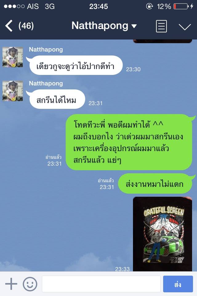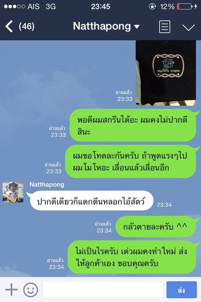 คือตอนนั้นร้านผมยังไม่เสร็จไม่ดีสมบูรณ์ วันนั้นผมจะทำงาน จะถ่ายบล็อกแต่ไฟในตึกไม่พอ เลยหาร้านที่มันเปิด24ชั่วโมง เพื่อที่จะหาที่ถ่ายบล็อก พอมาเจอร้านนี้ ลองโทไปคุย บอกว่า ผมต้องส่งงานอีกวันก่อน4โมง ละคือกผมบอกลูกค้าแล้วว่าทำทันแน่นอน แต่พอเจอปัญหาถ่ายบล็อกไม่ได้ เลยคุยกับเขา เขาก็พูดดี นัดผมว่าให้เข้าไปที่ร้านสุขุมวิท16 ซอยเศรษฐี2 นัดผม11โมง เขาบอกจะช่วยสกรีน บอกลูกค้าไปเลยว่าบ่าย3ทันแค่80ตัว ผมไปรอตั้งแต่10โมง เขามาบ่าย2 คืนนั้นเขาทำบล็อกขอค่าถ่ายบล็อกบล็อกละ100ละเดียวสอนสกรีนด้วย ขอค่าสอนพันนึง จริงๆคือผมเป็นหมด แต่ผมทำเหมือนไม่เป็น เพื่อได้เทคนิคใหม่ๆ พอเขามาบ่าย2มาถึงบอกทำไม่ทันให้เลื่อนลูกค้าเป็น6โมงเย็น ผมก็บอกลูกค้าไป คือผมเสียละ2รอบ พอมาถึงเขาบอกขอทำงานค้างมันก่อน ให้ผมช่วยวางผ้า ไดรเป่าสี ทำนั้นทำนี้ เหมือนเรียกผมไปใช้งาน พอ6โมงไม่เสร็จเขาบอกวันนี้ไม่เสร็จให้ไปบอกลูกค้าว่าไม่เสร็จ ผมก้เลยโทไปบอกไปคุยกับเขาเลื่อนเขาอีกผมเสียละรอบ3 พอเขาถ่ายบล็อกเสร็จ2ทุ่ม ผมก้กลับมาสกรีนที่ร้าน ไฟทั้งตึกมันไม่พอ เลยหาร้านสกรีน พอกำลังจะไป เขาโทมาถามว่างานเสร็จยัง มาให้พี่ช่วยทำมั้ย พี่คิดตัวละ50สีผมบล็อกผมเสื้อผม ผมก็เลยเอาวะเข้าเนื้อช่างมัน เอาลูกค้าไว้ก่อน เขาบอกให้เอาบล็อกเอาเสื้อไปให้มันเลยวันพุธ เชื่อปะผมขับเอาไปให้เขาถึงสมุครสาคร เพื่อที่ผมอยากให้งานเสร็จ เขาบอกจริงๆวันเดียวเสร็จ แต่พี่ขอ2วัน พอไปถึงง่วงก็ง่วงไกลก็ไกล โอเควะช่างมัน สรุปนัดส่งวันศุกร์ก่อนเที่ยง เขาคิดผมตัวละ70คือ เขาจะใช้สีของเขา ผมเลยต่อเขาเหลือ60 เขาขอเก็บตังก่อน ผมก็ให้จ่ายเต็มด้วย ละพอวันศุกร์ ผมทั้งโทรทั้งทักไป เขาอ่านไม่ตอบ ไม่อ่านบ้าง โทไปไม่รับ จู่ๆทักผมมาวันศุกร์ตอนบ่าย วันอังคารมารับเสื้อนะ ผมปี๊ดเเล้ว เพราะผมนัดลูกค้าส่งวันเสา อุสาเพื่อวันนึง เขาบอกผมว่ามารับงานด่วนที่สิงบุรี20000ตัว งานด่วน ละคือผมสั่งก่อน จ้างก่อนไม่ใช่หรอ ผมก็ลูกค้านะ ผมเลยบอกงั้นขอก่อน40ตัว ต้องรีบส่งจริงๆลูกค้าด่าผมเเล้ว เขาเลยบอกโอเค วันเสาก่อนเที่ยงมาเอา พอวันเสาทั้งโททั้งทักไม่ตอบ พอโทละเขารับ เขาให้แฟนเขารับ บอกว่าค่อยมาเอาพรุ่งนี้วันอาทิตทีเดียวมั้ย ตอนนี้ใกล้เสร็จแล้ว ผมแบบ เออทำไงได้วะ พอวันอาทิตผมโทรจี้ๆๆๆ เขาบอกเสร็จเดี๋ยวโทรไปๆๆ เขาพูดอยู่แค่เนี้ย พอผมไปถึง ฝนตกเลยไม่ได้เช็คของ ละกลับมาถึงผมเช็คของจะส่งงาน ละเป็นไงละ เละทุกตัว ลายเคลื่อน เบี้ยว เลอะ ครบ ร้านนี้เลย ครับ