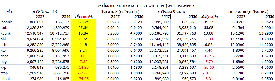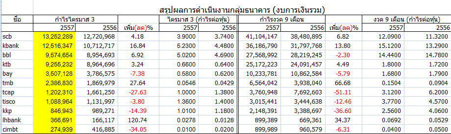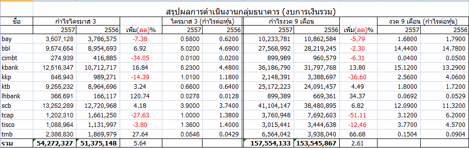 สรุปผลการดำเนินงานกลุ่มธนาคาร ไตรมาสสาม ปี 2557