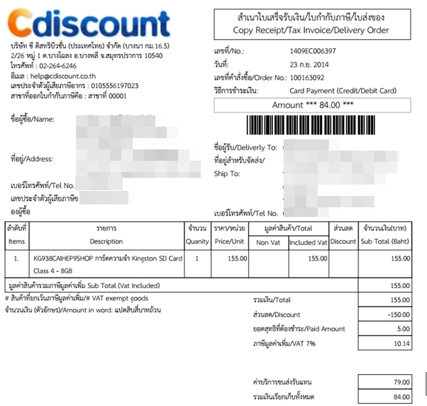 เมื่อวันที่ 23 ก.ย. 57 ผมได้ทำการสั่งซื้อสินค้ากับ Cdiscount เป็น การ์ดความจำ Kingston SD Card Class 4 - 8GB มูลค่า 155 บาท