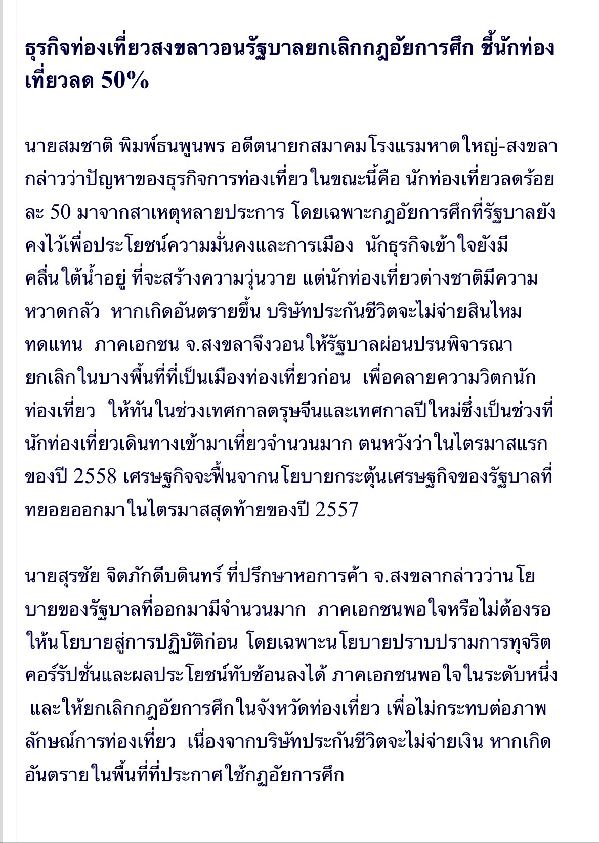 อ้าว นึกว่ากำลังมีความสุข "สงขลาวอนยกเลิกกฏอัยการศึกชี้นักท่องเที่ยวลดกว่า 50 เปอร์เซ็นต์"