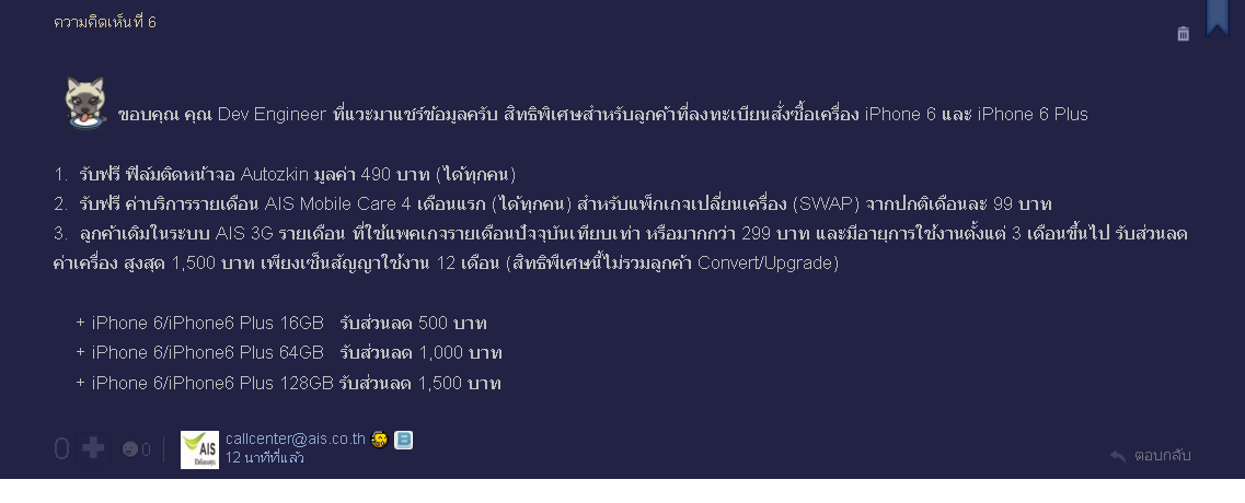 สอบถาม AIS เรื่องเงื่อนไขด้านราคา iPhone6 และ iPhone6+