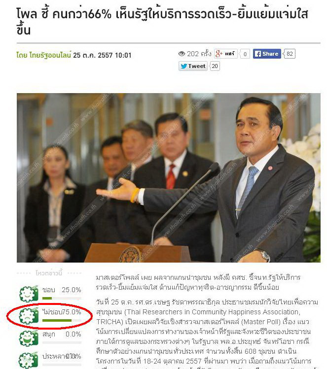 วันที่ 25 ต.ค. รศ.ดร.เชษฐ รัชดาพรรณาธิกุล ประธานชมรมนักวิจัยไทยเพื่อความสุขชุมชน (Thai Researchers in Community Happiness Association, TRICHA) เปิดเผยผลวิจัยเชิงสำรวจมาสเตอร์โพลล์ (Master Poll) เรื่อง แนวโน้มการเปลี่ยนแปลงการทำงานของเจ้าหน้าที่รัฐและจังหวะชีวิตของประชาชนภายใต้การดูแลของกระทรวงต่างๆ ในรัฐบาล พล.อ.ประยุทธ์ จันทร์โอชา กรณีศึกษาตัวอย่างแกนนำชุมชนทั่วประเทศ จำนวนทั้งสิ้น 608 ชุมชน ดำเนินโครงการในวันที่ 18-24 ตุลาคม 2557 ที่ผ่านมา พบว่า เมื่อถามถึงแนวโน้มการเปลี่ยนแปลงการทำงานของเจ้าหน้าที่รัฐโดยรวม หลังจากมี คสช. และรัฐบาลเข้ามาบริหารประเทศ พบว่า ส่วนใหญ่หรือร้อยละ 66.6 ระบุเจ้าหน้าที่รัฐมีความรวดเร็วในการให้บริการประชาชนดีขึ้น รองลงมาคือ ร้อยละ 62.0 ระบุความยิ้มแย้มแจ่มใสในการให้บริการดีขึ้น ร้อยละ 60.2 ระบุข้าราชการนำหลักค่านิยม 12 ประการมาประยุกต์ใช้ในการทำงานดีขึ้น และร้อยละ 59.4 ระบุความโปร่งใสในการทำงานดีขึ้น