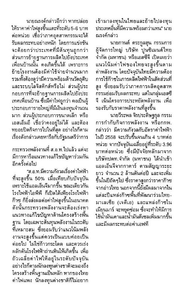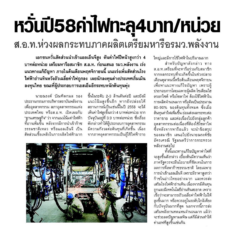หวั่นปี 2558 ค่าไฟทะลุ4บาท/หน่วย ส.อ.ท.ห่วงผลกระทบภาคผลิต เตรียม.หารือ รมว.พลังงาน
