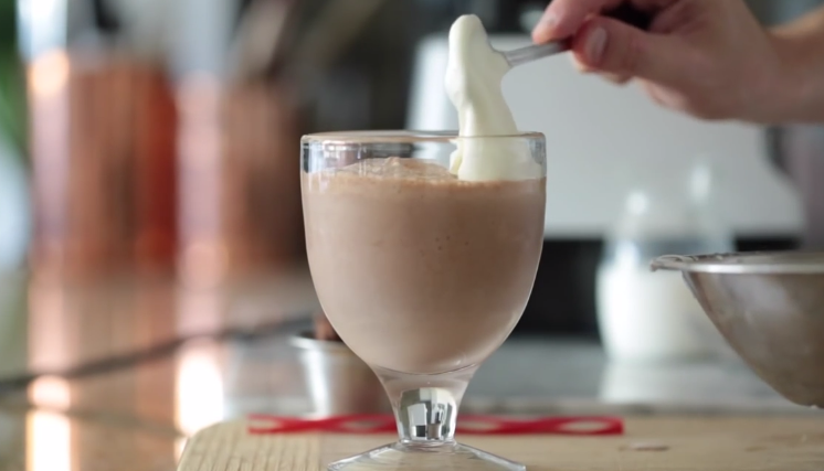 นำวิปครีมที่ทำไว้มาเทบนตัวมิลค์เชค ตามด้วยโรยชอกโกแลตเพื่อตกแต่ง