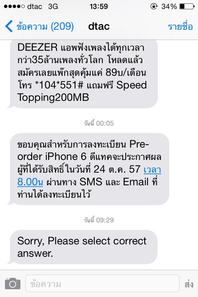 หลังจากนั้นก็ได้โทรเข้าไปหา dtac1678 แล้ว สอบถามเรื่องที่เกิด ขึ้น ดีแทคก็ให้คำตอบว่า ระบบของทางเราทำการส่งแบบไม่ได้เรียงผู้ที่ลงทะเบียน สรุปก็คือ 1700 คนนี้ sms จะทยอยส่งให้ จนถึงช่วงเที่ยงในวันเดียวกันนั้นเอง ผมก็รอไปๆๆๆๆๆๆ จน 11 โมงทนไม่ไหวได้โทรไปถามว่า sms ยังไม่มาเลย คราวนี้ก็เล่าเรื่องทั้งหมดให้ฟัง ทั้งเรื่องคนอื่นที่ได้ลงทะเบียนช้ากว่าเรา ทางdtac ก้เข้าใจแล้วบอกให้รอจนถึงช่วงเที่ยง เราก็คิดเสมอยังไงก็ต้องได้เพราะว่า 0.09 ยังได้เลย แล้วทำไม 0.05 จะไม่ได้ เอ้ออออ หลังจากนั้น 12.30 มันไม่มาก้โทรกลับไปคราวนี้คุยกับ cc ผู้ชาย ก็ถามทั้งหมด ว่า 1700 คนนี้ เกิดจาก 1700 คนแรกที่ได้ลงทะเบียนหรือเกิดจากการสุ่มหา1700คนจากบริษัท ผมก็ได้รับคำตอบมาว่า 1700 คนที่ได้ลงทะเบียน ผมก็ถามอีกใครลงเร็วได้เร็วใช่มั้ย ทางบริษัทก็บอกใช่ หลังจากนั้นผมก็เริ่มหาข้อมูลที่จะเป็นประโยชน์เพราะ การซื้อเครื่องนั้น 13.00-20.00 ผู้มีสิทธิ์จะสามารถซื้อได้แต่ผมยังไม่ได้รับสิทธิ์นั้น ก็เลยถาม ทาง dtac facebook เล่าเรื่องที่เราต้องการให้เค้าฟัง เค้าก็บอกว่า ขอเบอร์กับทาง email หน่อยก็ให้ไป คำตอบที่ได้ก็บอกว่า ลูกค้าไม่ได้รับสิทธิ์นะค่ะ ( เอิ่มคือ งง แล้วทำไมหลัง 8.00 ไม่มี sms อะไรมาบอกแบบคนอื่นมั่งเลยว่าได้รับสิทธิ์หรือไม่ได้รับสิทธิ์)