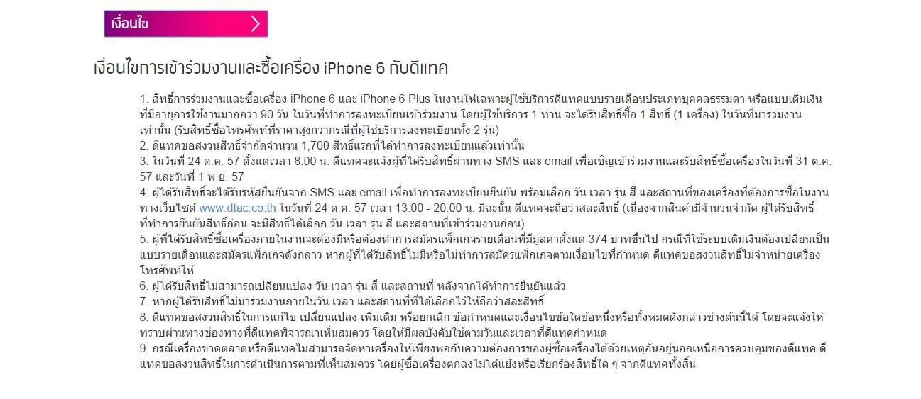 หลังจากผู้ให้บริการใหญ่อย่าง dtac ได้ออกมาประกาศ เรื่อง การลงทะเบียนเพื่อรอรับสิทธิ์ในการเป็นผู้มีวสิทธิ์ในการซื้อไอโฟน 6 เมื่อวันที่ 24 ตุลาคม 2557 0.01 น.