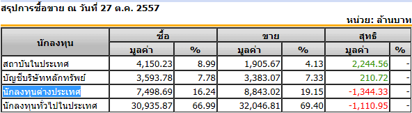 Sinthorn Summary 27/10/2557 : ต่างชาติขายสุทธิ -1,344.33 ลบ.
