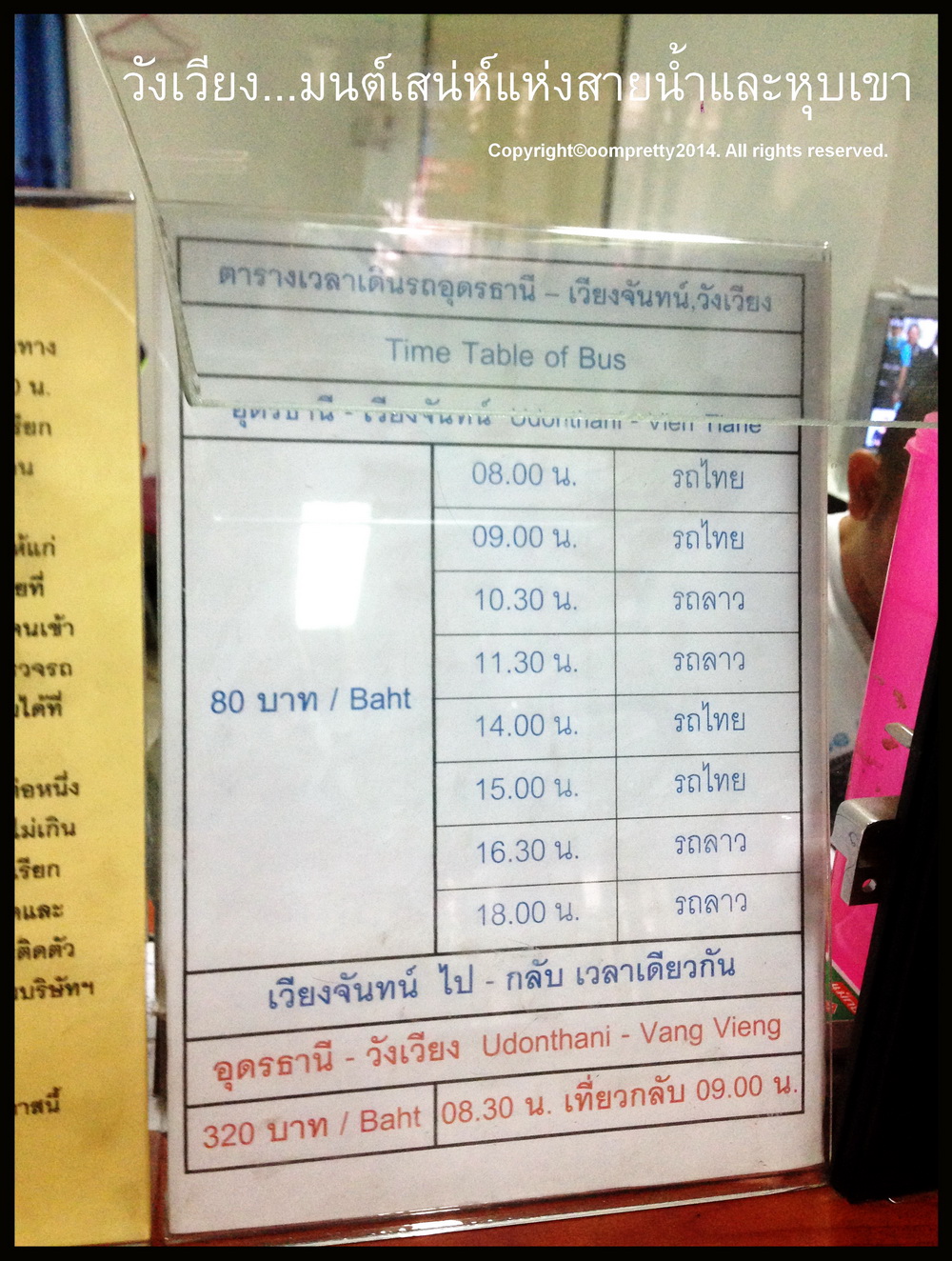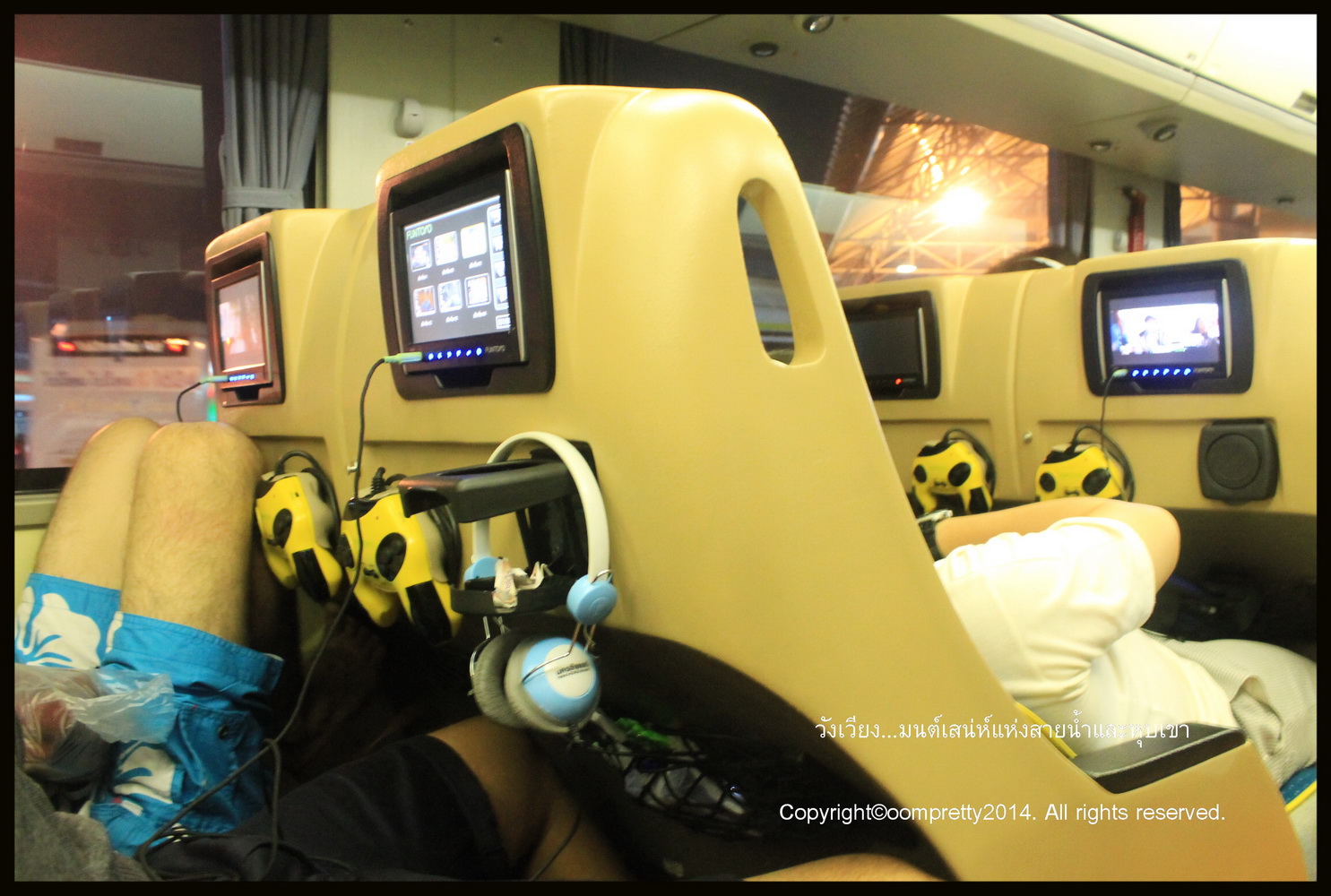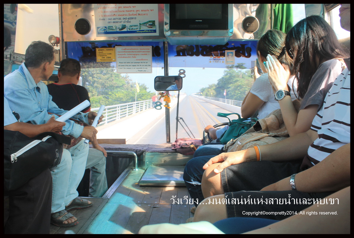 เราเริ่มหาข้อมูลต่างๆ โดยมากก็จากในพันทิปนี่แหละค่ะ เพื่อนๆรีวิวได้ละเอียดมาก แต่ในความเป็นจริง การเดินทางก็ไม่ได้สวยหรู ตามที่คาดหวังไว้แต่อย่างใด เริ่มเลยนะคะ เราตกลงใจนั่งรถทัวร์ กทม. - อุดรค่ะ ของนครชัยร์แอร์ ราคา 525 บาท ตอน 22.50 ถึง อุดร ก็ 8.00 เพราะ รถเข้า late ไปเกือบครึ่งชม. จองล่วงหน้าก่อนประมาณ 3 อาทิตย์ เพราะช่วงที่ไปเป็นวันหยุดยาว ไม่กล้าเสี่ยงไปตายเอาดาบหน้า แล้วค่อยซื้อตั๋วรถทัวร์ อุดร หนองคาย วังเวียง รถ VIP บริการดี มีทีวี เกมส์ ดูหนัง ฟังเพลง ได้ตลอดการเดินทางไม่มีเบื่อแถมเบาะนวดไฟฟ้าอีกตั้งหาก แต่กว่าจะถึงก็เล่นเอาปวดขาใช่ย่อย เพราะนั่งนานไปหน่อย บรรยากาศบนรถค่ะ