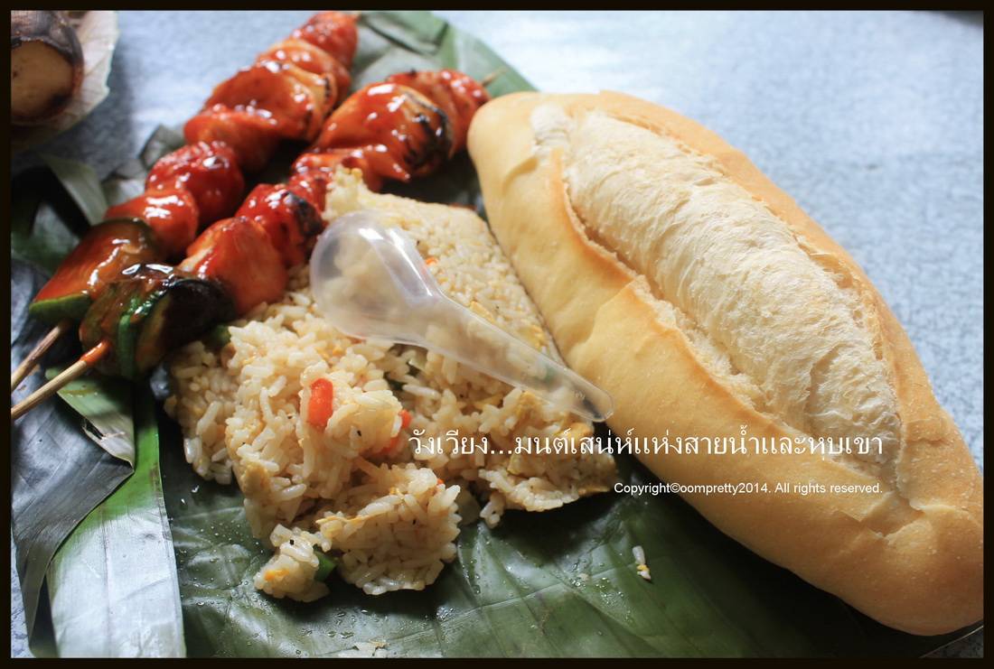 ประมาณเที่ยงๆก็เสร็จแล้ว ออกมาจากถ้ำก็มีอาหารไว้ให้ มีข้าวผัดห่อใบตอง บาร์บีคิว 2 ไม้ ก่อไฟย่างกันสดๆตอนเราไปเล่นน้ำกัน มีผลไม้คือกล้วยกับมะละกอสีสวยน่ากิน หวานน้อยแต่อร่อยดีค่ะ มีขนมปังเช่นเคย เล่นกินทีนึงนี่อิ่มหนักพุงเลย